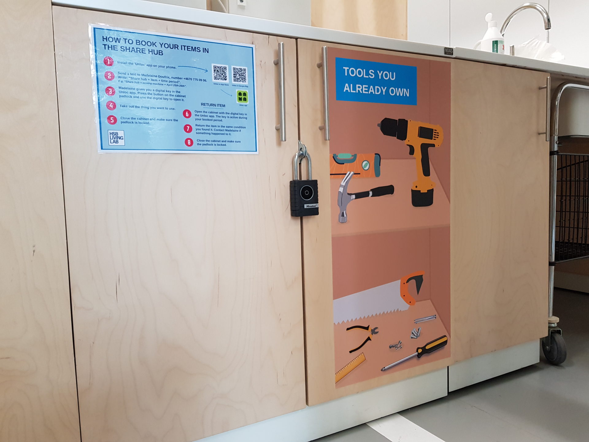 Residents in HSB’s Living Lab have the opportunity to borrow items such as tools, kitchen utensils, sewing machines, irons, exercise equipment, and kubb games. The items are easily accessible to everyone and are stored in two shared lockers in the common space on the entrance floor. But many of the residents didn’t know the lockers existed and didn’t know how they worked, so we at Nudgd were tasked with making the lockers visible, instructing, reminding them of the opportunity, and encouraging the use of the shared possessions.